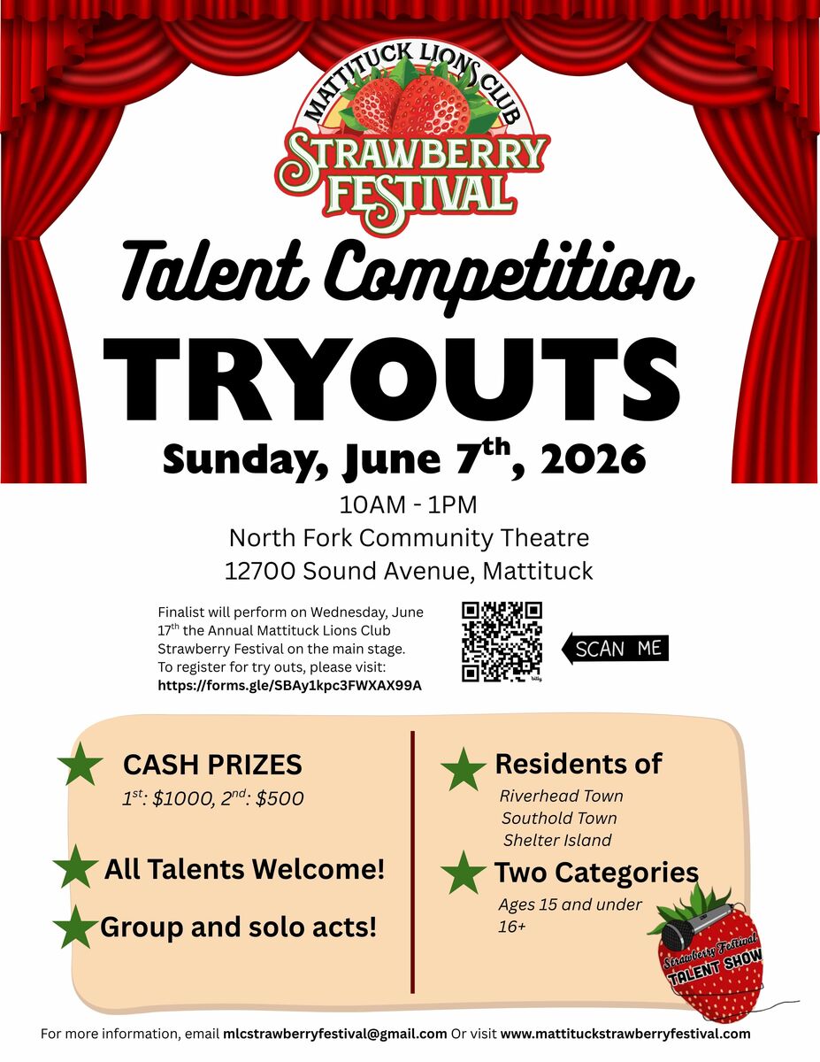 MATTITUCK LIONS CLUB STRAWBERRY FESTIVAL TALENT COMPETIITON TRYOUTSSunday, June 7th, 202610AM -1PM North Fork Community Theatre12700 Sound Avenue, MattituckFinalist will perform on Wednesday, June ...